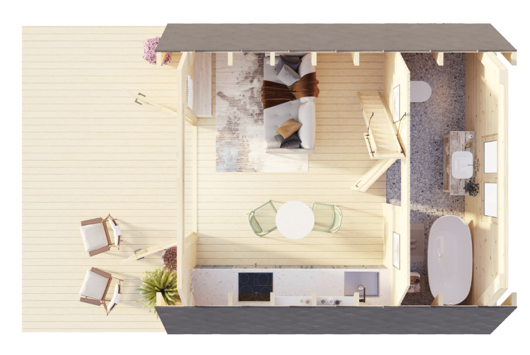 Casa in legno A-FRAME di 30mq con soppalco adibito zona notte per 2 persone e grande open-space living che, se dotato di divano letto può ospitare altre 2 persone. Costruito con robuste travi in legno e caratterizzato dal moderno design ad A, quindi chiamata proprio A-FRAME, questa casa si adatta perfettamente ad essere utilizzata come casa vacanza o tiny home per i weekend fuori città. Spesso usata anche nei glamping e villaggi vacanza per creare ambienti esclusivi e di grande comfort. Infatti, il livello di isolamento termico è molto elevato con coibentazione delle due pareti verticali di 100mm di spessore di materiale isolante, cosi come l'isolamento del pavimento.