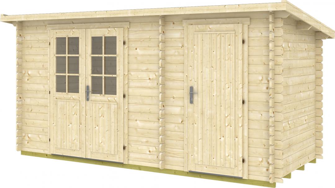 Casetta in legno da giardino a tetto monofalda e a due vani e due porte di accesso per giardino, piscina o atrio interno. Casetta dallo stile classico con tetto piatto che dona pregio ad ogni ambiente in cui viene inserita. La casetta prefabbricata è dotata di porta semi-vetrata e di seconda porta piena. Sia il tetto che il pavimento sono composti da assi di spessore 18mm. Il tetto, dalla linea piatta, ha in realtà una pendenza verso il lato posteriore al fine di permettere l'asportazione dell'acqua piovana, senza intaccare il design della casetta.