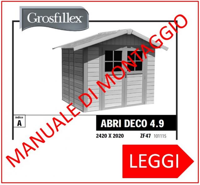 Questa casetta da giardino in PVC può essere facilmente montata da 2 persone non esperte in poche ore ed utilizzando solo dei comuni strumenti. Visiona i nostri video-tutorial al montaggio facile, oppure scarica il manuale di montaggio di questa casetta in resina GROSFILLEX. Gli OPTIONAL addizionali che puoi richiedere per completare la tua casetta sono: 1) kit di ancoraggio, 2) kit tettoia laterale.
