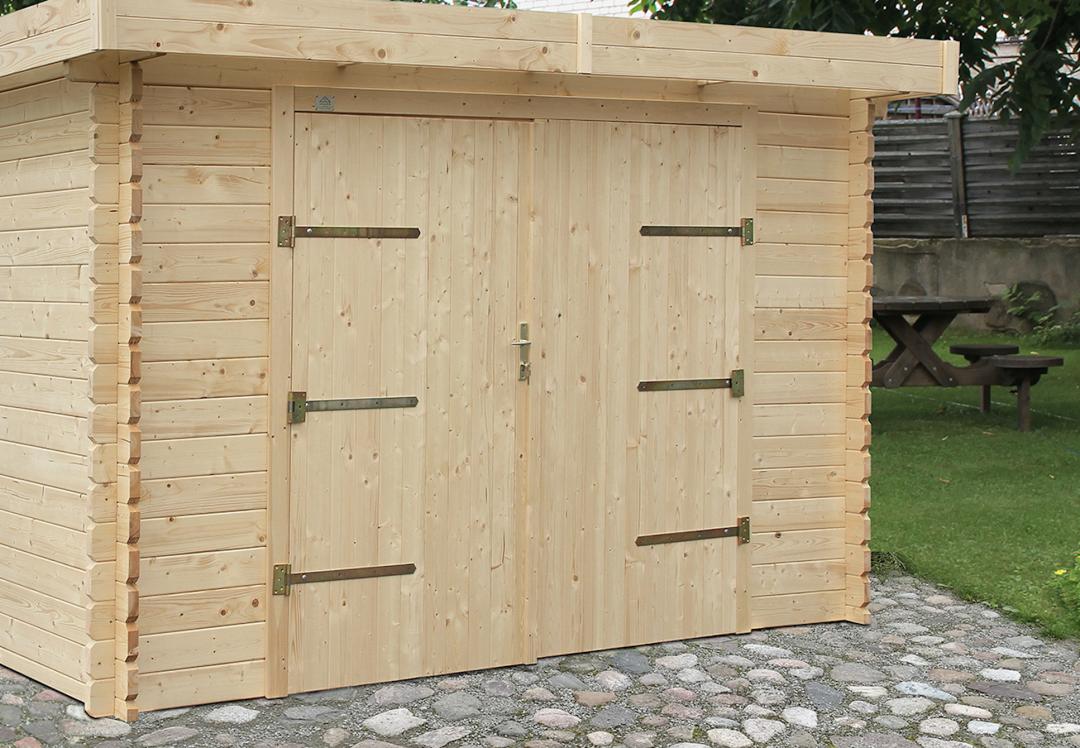 Garage in legno con struttura in legno BLOCKHOUSE massiccio con tetto monofalda nascosto da ampio fascione perimetrale. Il portone è in stile classico con cerniere robuste (disponibile anche con portone basculante HORMANN rigorosamente made-in-Germany). - maggiori info QUI). Ampio portone frontale e dotato di porta pedonale laterale per permettere la miglior gestione logistica (su richiesta è possibile aggiungere finestre su qualsiasi parete). Rigorosamente in legno di abete nordico, ha le cerniere del portone a vista che ne denotano lo stile unico. Gli infissi sono rifiniti con robusti doppi-vetri e con guarnizione in gomma isolante che ne garantisce la tenuta termica nel tempo.